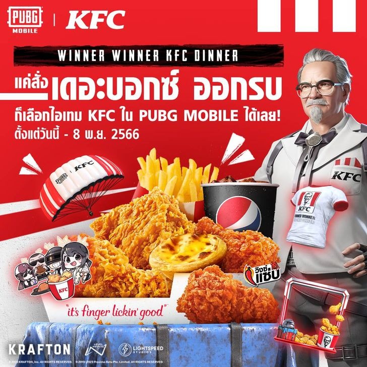PUBG MOBILE รวมทีมกับ KFC จัดแคมเปญพิเศษให้ผู้เล่นสามารถลิ้มรสชาติแห่งชัยชนะไปพร้อมกับการเป็นเจ้าของสกินและไอเทมในเกมสุดเอ็กซ์คลูซีฟจาก KFC เพียงซื้อเมนู The Box ชุดใดก็ได้ เพื่อรับสิทธิ์เลือกรับรางวัลระหว่าง สกินเสื้อ KFC, สกินร่มชูชีพ KFC, สเปรย์ KFC, กรอบโปรไฟล์ KFC นอกจากนั้นยังมีไอเทมพิเศษ อย่าง สกินผู้พัน KFC และสกินคอสตูม KFC สุดเท่ ที่จะจำกัดให้เลือกภายในช่วงเวลา 20.00 น. ของทุกวัน (มาก่อนมีสิทธิ์ก่อน) โดยโปรโมชั่นจากความร่วมมือสุดพิเศษนี้จะมีขึ้นตั้งแต่วันที่ 5 ตุลาคม 2566 - 8 พฤศจิกายน 2566 หรือจนกว่าสินค้าหมด