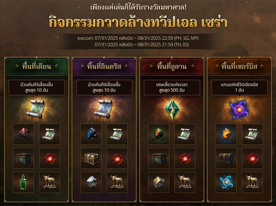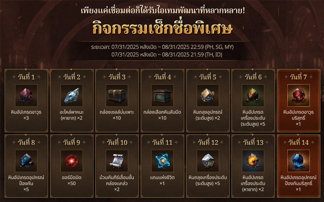 • กิจกรรมเช็กอิน: ล็อกอินครบ 7 และ 14 วัน รับไอเทมสนับสนุนความก้าวหน้า เช่น Temporal Pieces และชิ้นส่วนสัตว์ขี่