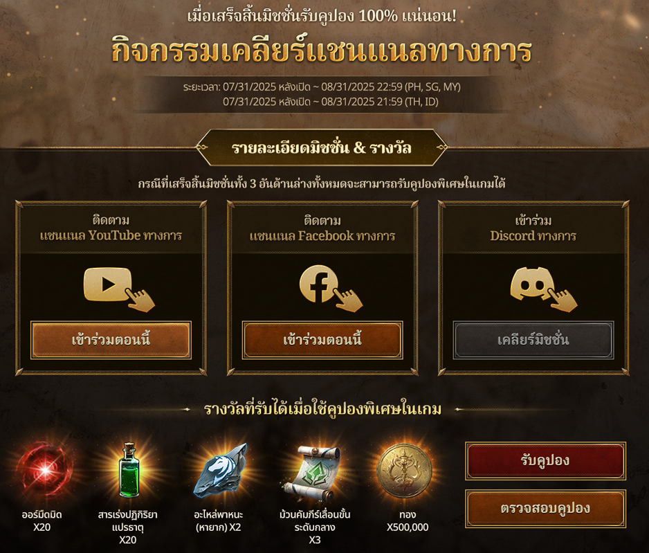 • แคมเปญ Official Channel Clear: รับคูปองของรางวัลเมื่อทำภารกิจบน YouTube, Facebook และ Discord ครบ
